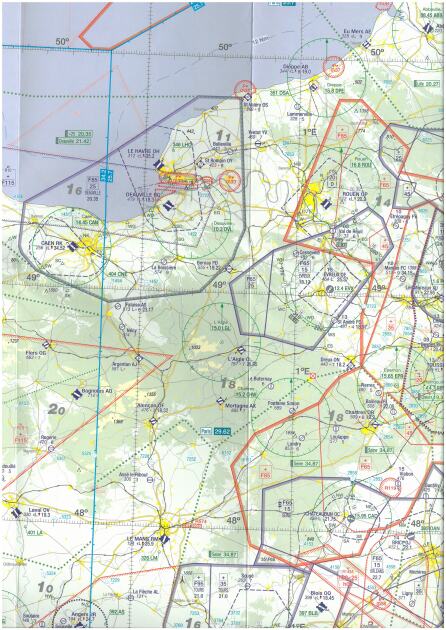 Les espaces aériens : les limites horizontales sont représentées en surimpression en rouge ou bleu foncé